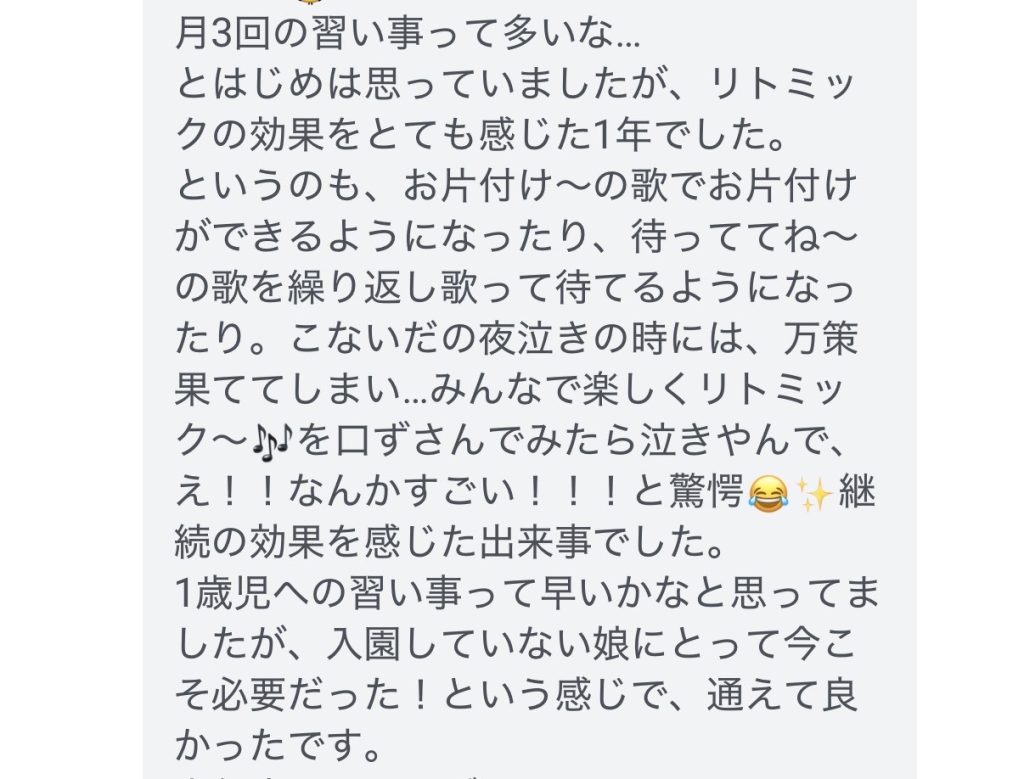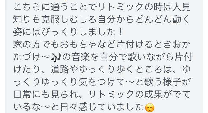 - リトミックの時間だけでなく、普段の生活の中でも教わった歌を歌ったりすることが大好きになり、家族で楽しい時間を持たせてもらっています。