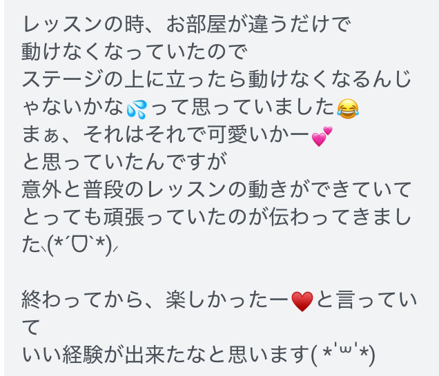 - レッスン後に家でやってみたら、歌に合わせて声を出せて、びっくり&感激しました。毎回のレッスンで変化・成長が見られてとても楽しいです。