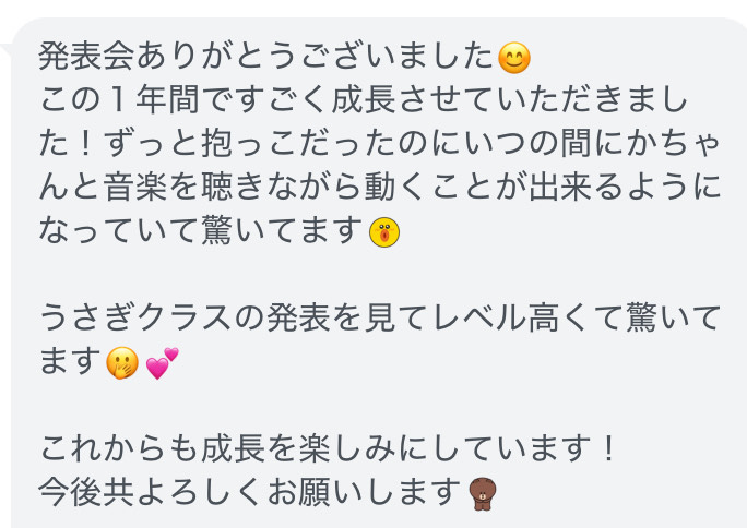 - ふと口ずさんでいる曲を聞くとリトミックで覚えた曲ばかりだし、みんなで楽器を演奏できるようになったりととにかく感動しました。